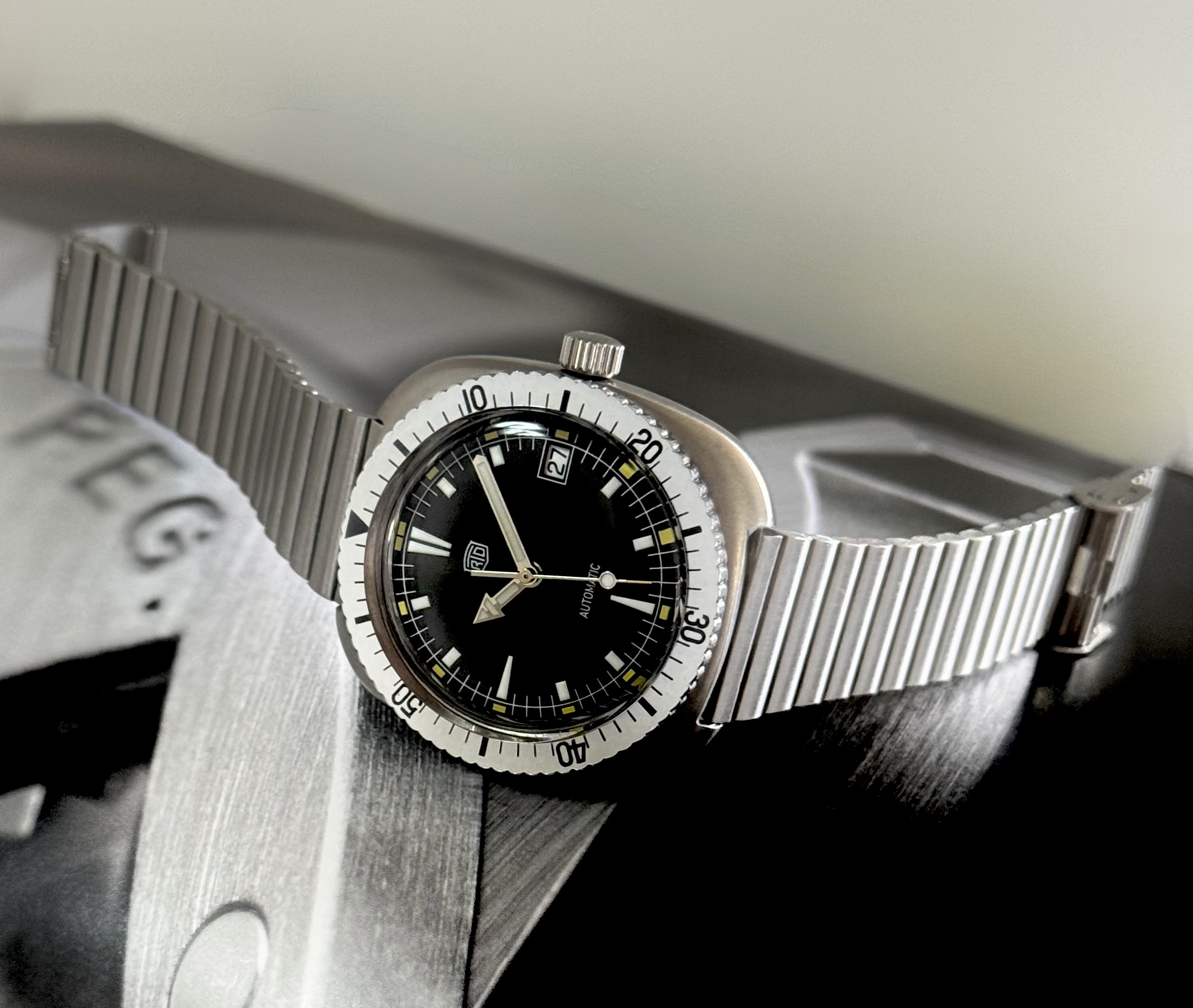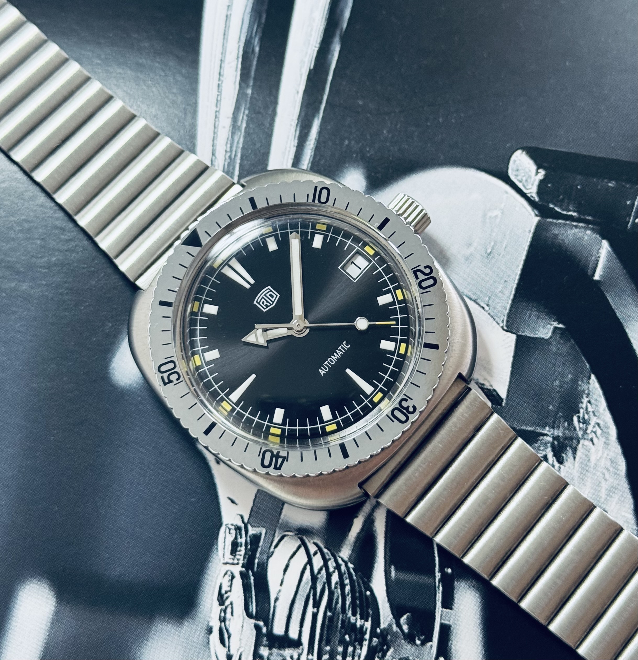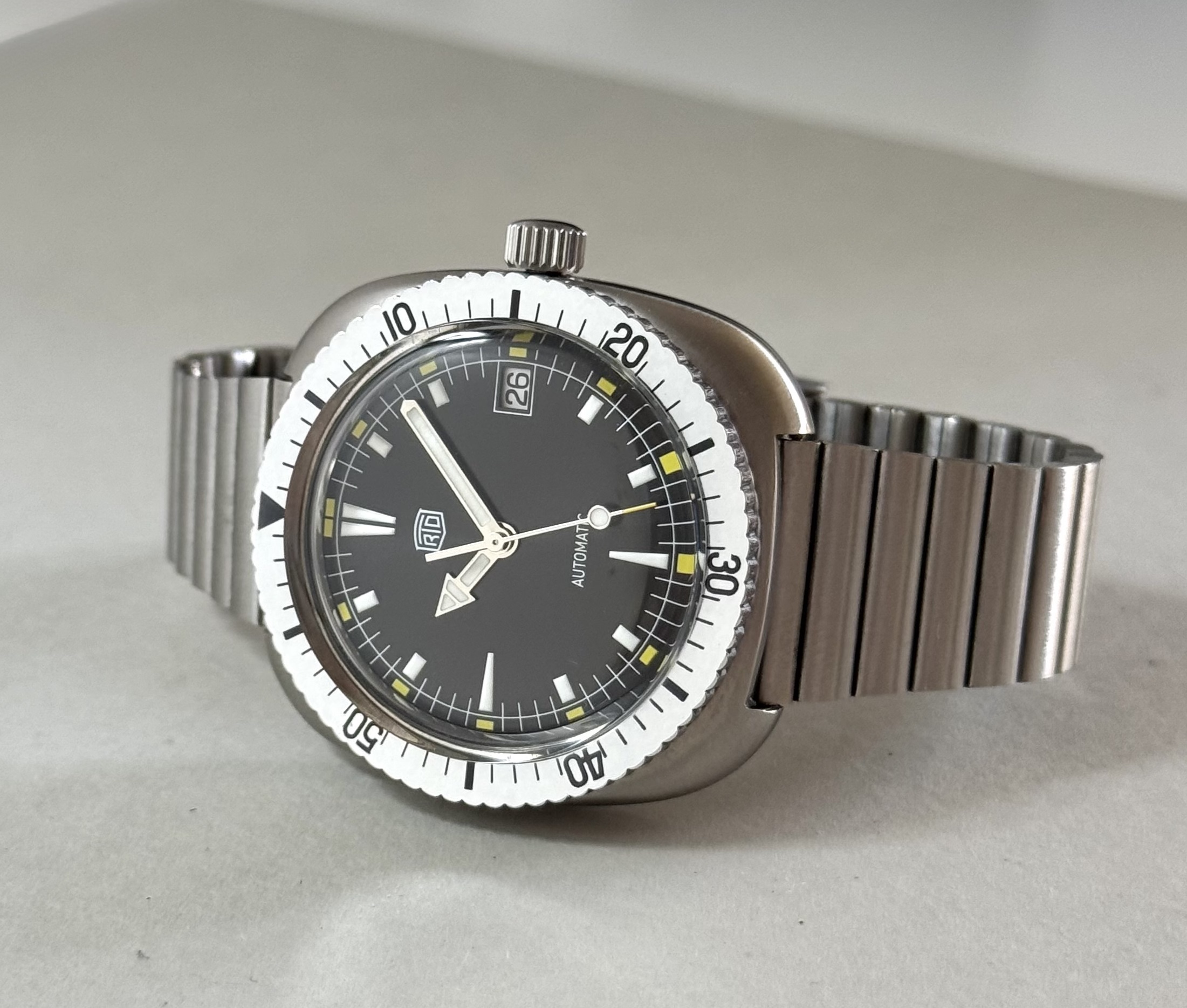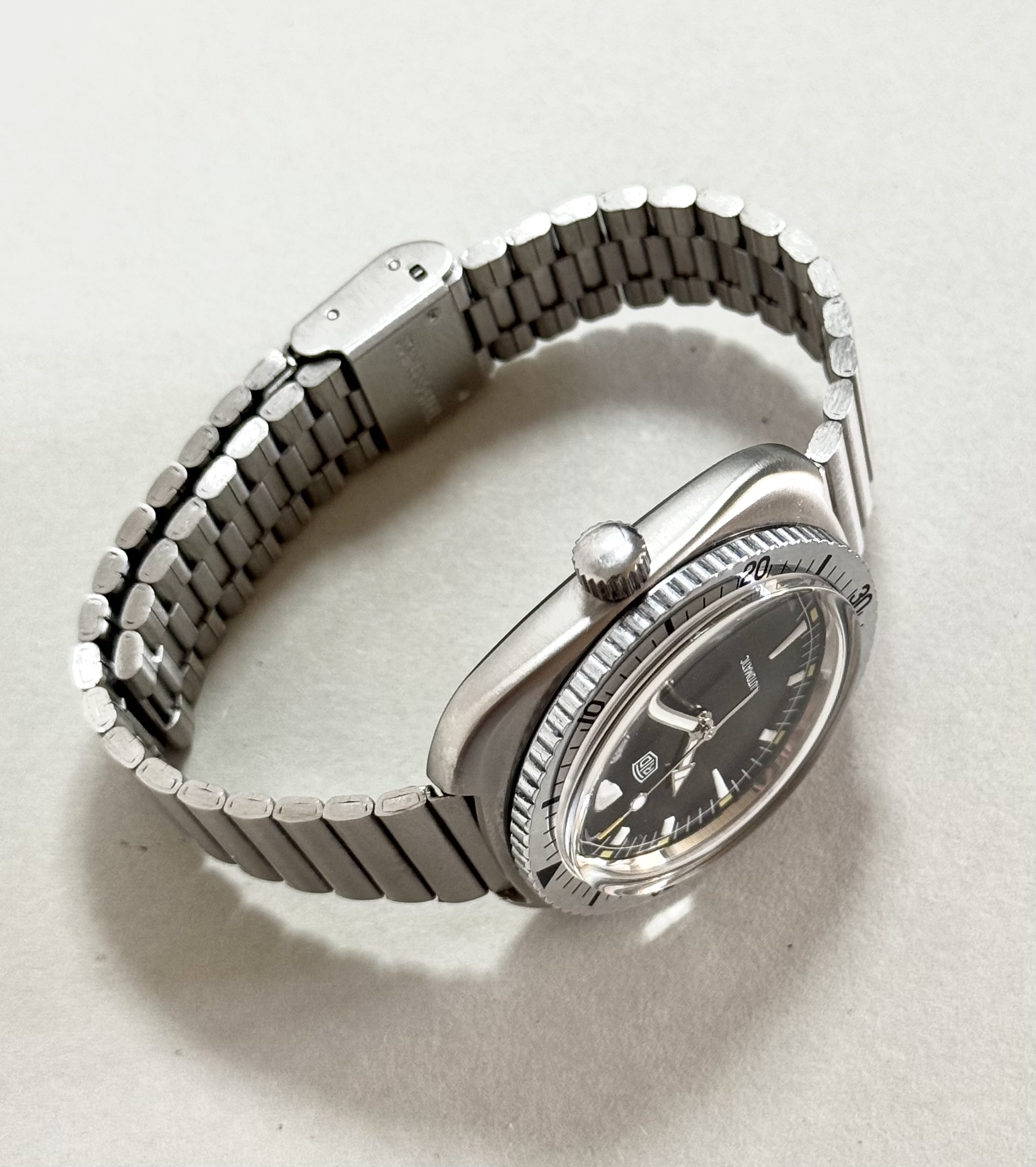 - Edelstahl-Gehäuse, gebürstet (NOS aus ca. 1970) – getestet auf 3 Bar