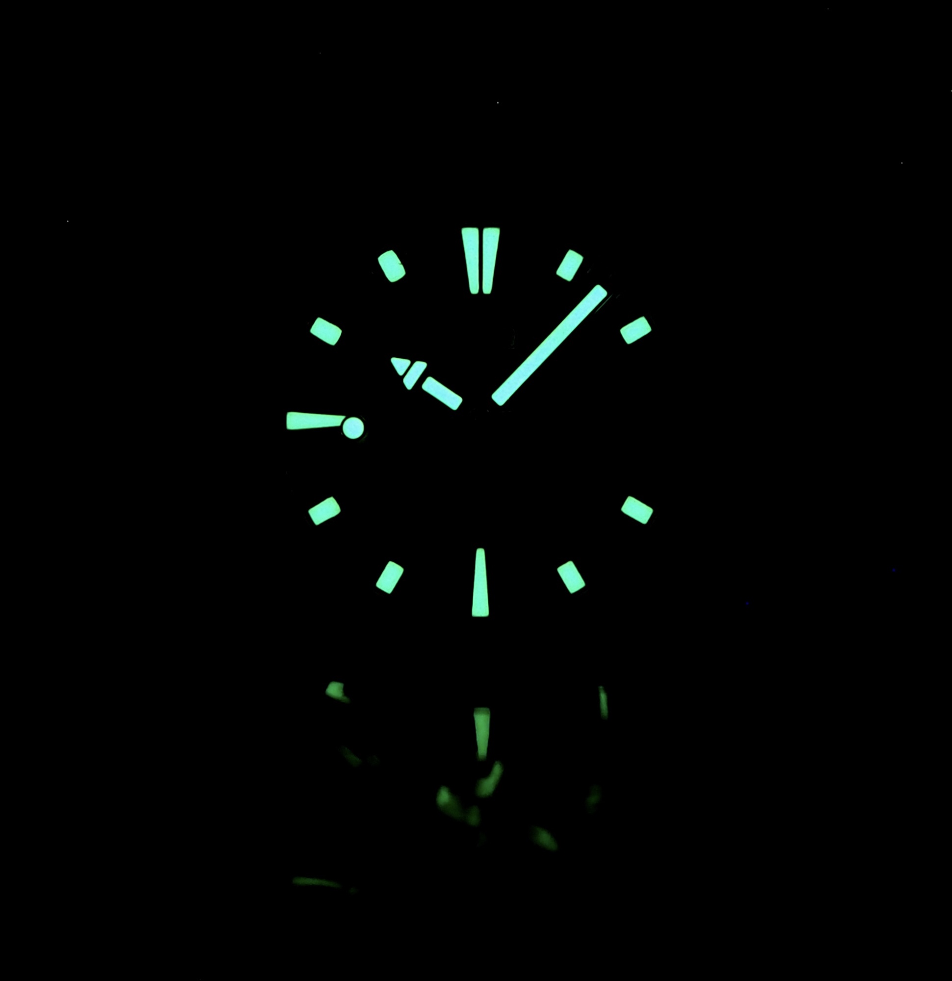 Die Zeiger sind aus Chrom und mit Super-Luminova (SLC1) belegt. Die Leuchtmasse erscheint bei Helligkeit weiß und leuchtet bei Dunkelheit in der Farbe grün. Das Zifferblatt ist ebenfalls mit dieser Leuchtmasse belegt.